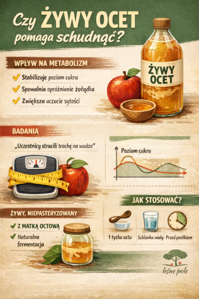 Żywy ocet – niefiltrowany i niepasteryzowany – to produkt powstały w wyniku naturalnej fermentacji. Zawiera kwas octowy, enzymy oraz tzw. matkę octową, czyli kolonię bakterii i związków powstających podczas fermentacji. Od dawna pojawia się w rozmowach o metabolizmie i kontroli masy ciała.